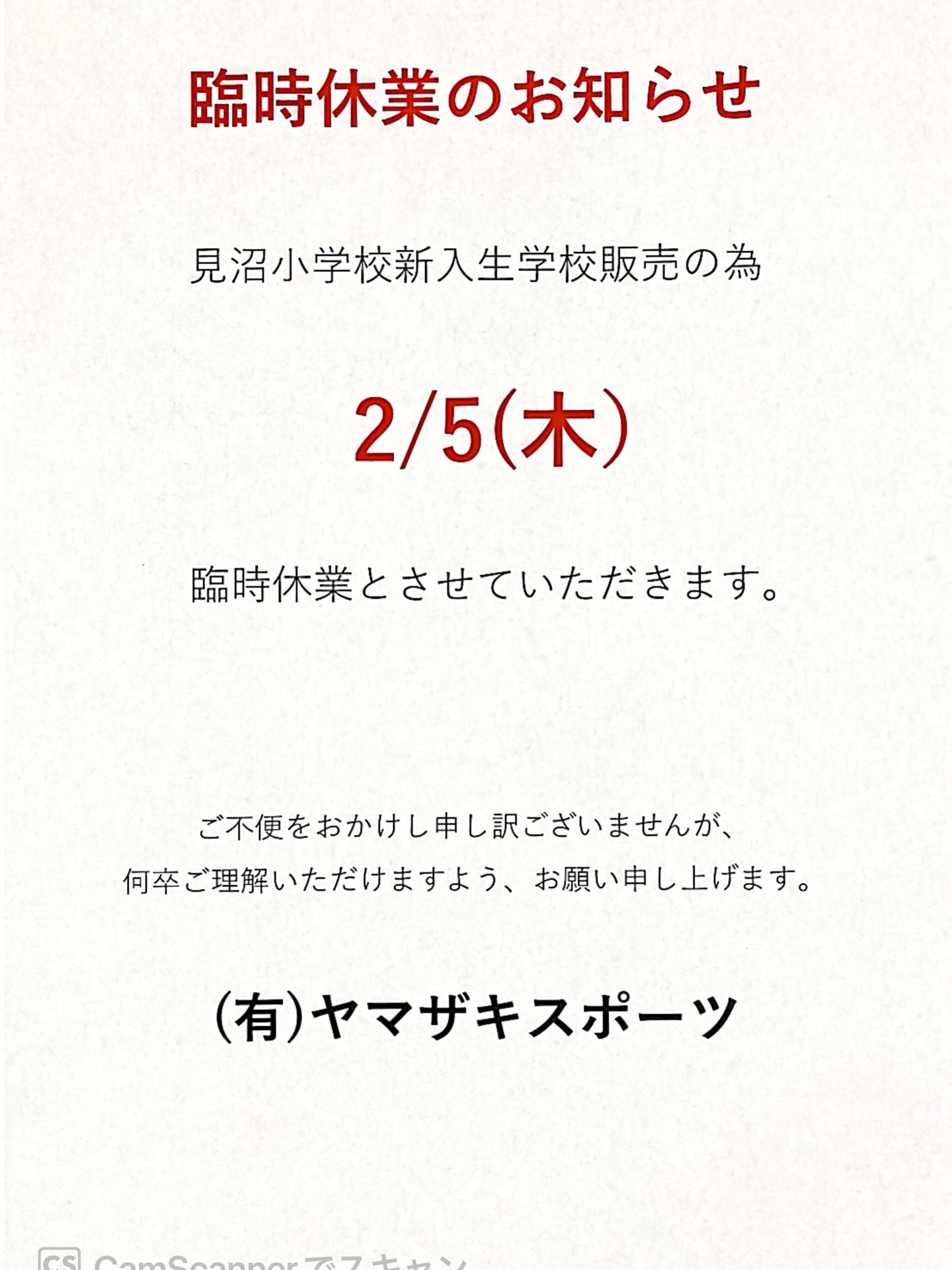 ヤマザキスポーツよりお知らせ❗️ 2月5日(木)は見沼小学校新入生の 一斉販売のため臨時休業致します ご利用のお客さまには大変 ご迷惑をおかけしますが ご理解をお願い致します #見沼小学校 #新一年生 #体操服一斉販売 #ヤマザキスポーツ #お知らせ